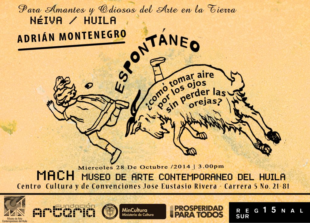 Hubo una vez en Neiva, como a finales del mes de Octubre, de año 2014, en que yo, Adrián Montenegro, en pleno uno de mis facultades artísticas, humanas y corrientes: Vi al rio Magdalena peor que la última vez Pero también: Soporté las temperaturas de calor nuevamente sin problema Y además: Me refresqué con los Impedimentos Pero también: Me encontré con Nubia en la librería Y además: Aproveché unos marcos abandonados Pero también: Me paseé por el centro Y además: Recordé y me sentí identificado en mis pensamientos con ese Hombre del Ancianato de Ibagué que sacaba sus manos por la ventana y gritaba «repuestos para la nevera» Pero también: Rechacé en varias ocasiones esas bolsas de los supermercados Y además: Se me preguntó ¿Qué tipo de Arte es el que hacia? Pero también: Hice de mi experiência algo más que comer achira o beber avena Y aunque hice muchas cosas más, otras me olvidé y otras me faltaron por hacer. Lo mejor fue que Expuse ESPONTÁNEO, ¿COMO TOMAR AIRE POR LOS OJOS SIN PERDER LAS OREJAS! Una exposición individual de camino por aquí. Muchas Gracias Martha, Profesor Jaime, Nubia y amigos visitantes. Muchas Gracias NEIVA