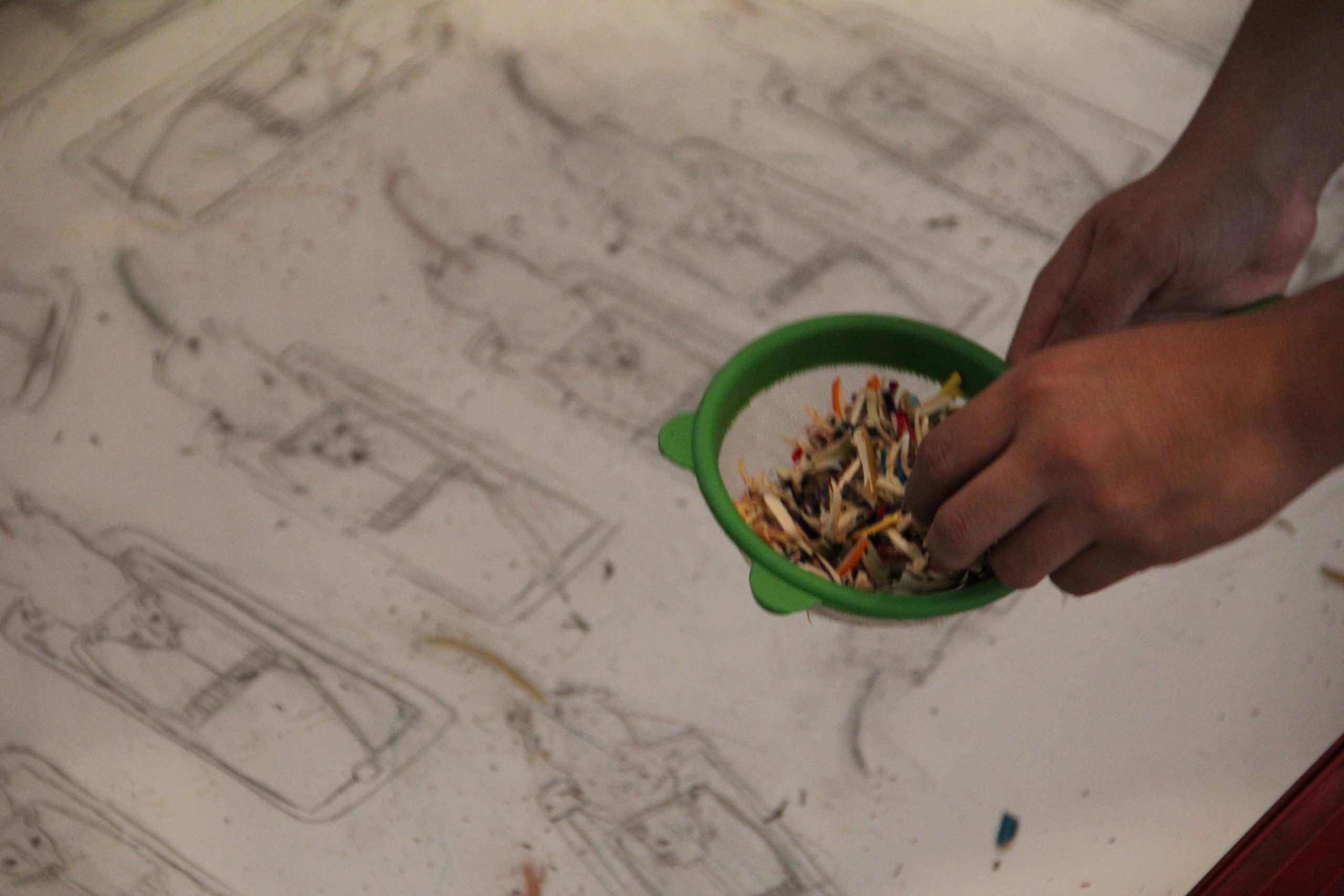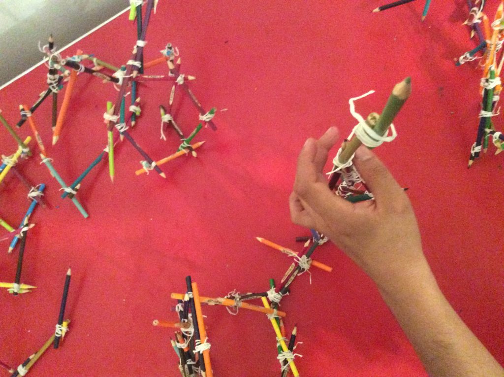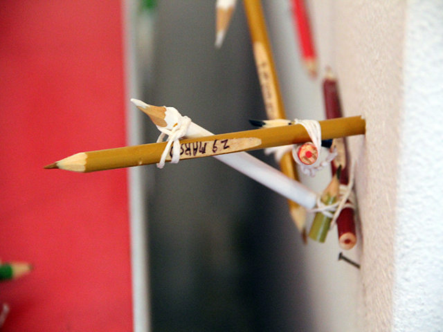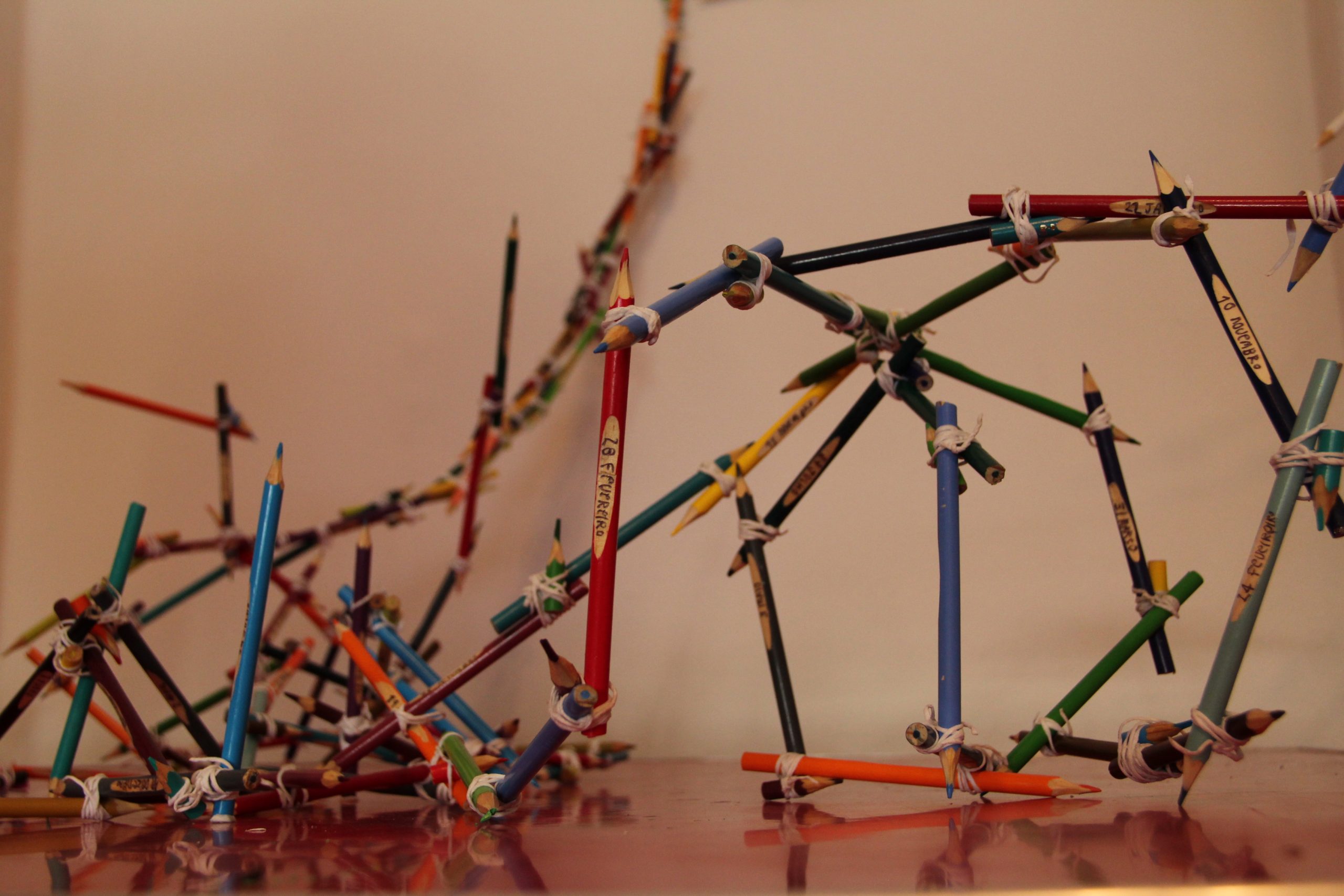 Proyecto de creación y exposición individual en el que armo una colección de 365 lapices de colores. A cada uno de los lápices le inscribo un número y un mes del año. Posterior-mente, sin establecer ningún tipo de orden logico, construye una estructura irregular con los lápices uniéndolos con cinta de papel y usando como apoyo las paredes y una mesa de dibujo ubicada en un espacio aproximadamente de 3m² En cada uno los cajones de la mesa de dibujo, instalo pliegos de pale a tamaño exacto y dibujo sobre ellos una serie de agrupaciones de objetos y cosas. Finalmente ubico un tapete frente al trabajo para que las personas puedan acercarse a detallar los dibujos y se paren sobre él para observar lo que hé realizado. En este proyecto conté con el el apoyo del Espacio Ponto Aurora de la ciudad de São Paulo y la asesoría y curaduría de: Lilian Maus